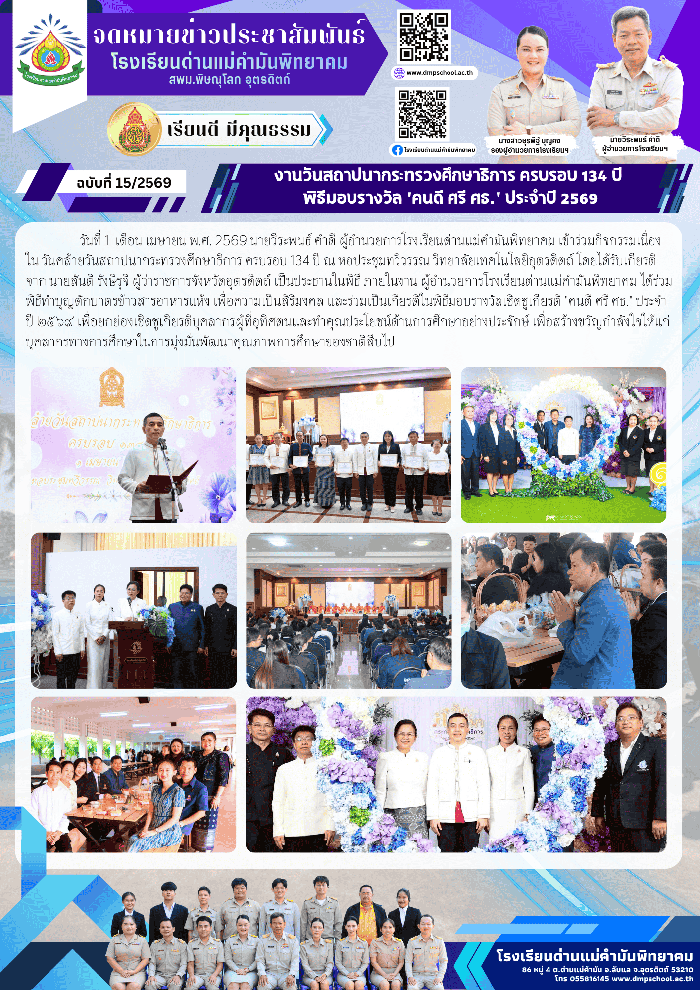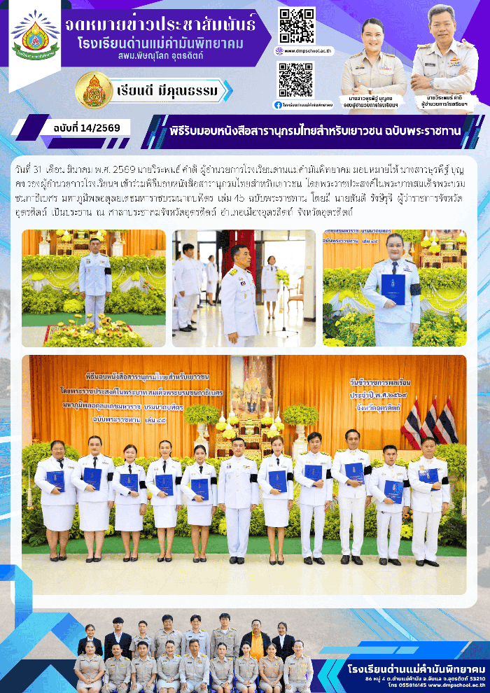 ประกาศโรงเรียนด่านแม่คำมันพิทยาคม เรื่อง การให้ข้าราชการครูและบุคลากรทางการศึกษาปฏิบัติงาน ณ ที่พักอาศัย (Work From Home) ระหว่างวันที่ 16-31 มีนาคม 2569 16 มี.ค. 69
